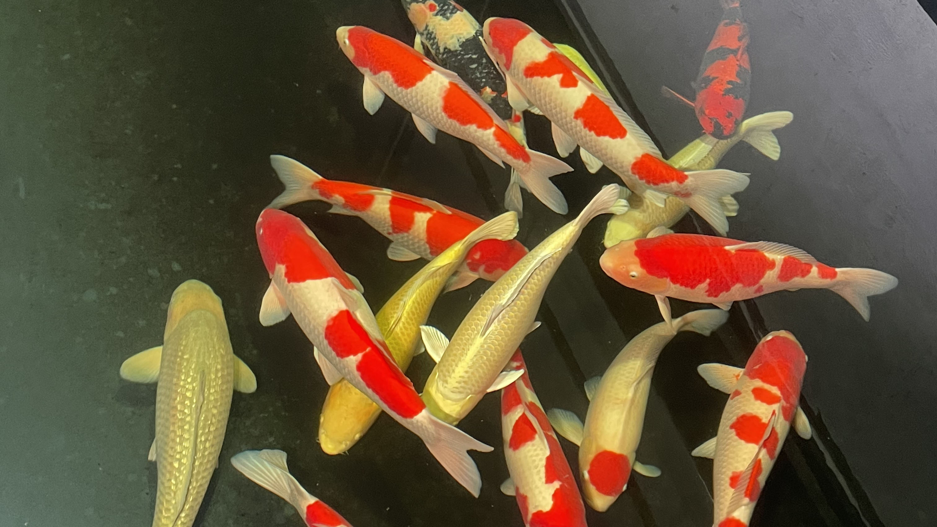 华鲤锦鲤最新搭配案例办公室鱼缸配60cm昭和三色红白锦鲤